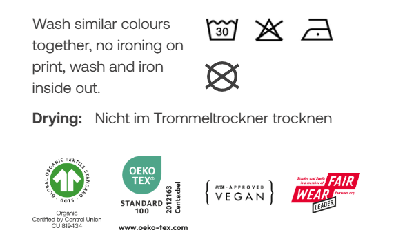Lieferzeit: Wir sammeln alle Bestellungen bis zum letzten Tag des Monats. Wenn eure Wunsch-Textilien auf Lager sind, gehen sie direkt in die Veredelung und sind innerhalb von vier Wochen bei euch. Falls ein Artikel mal schneller weg ist als gedacht, produzieren wir frisch nach. Da wir der Umwelt zuliebe auf effiziente Sammelproduktionen setzen, kann die Lieferung in diesem Fall bis August 2026 dauern. Danke, dass ihr gemeinsam mit uns auf Nachhaltigkeit setzt!